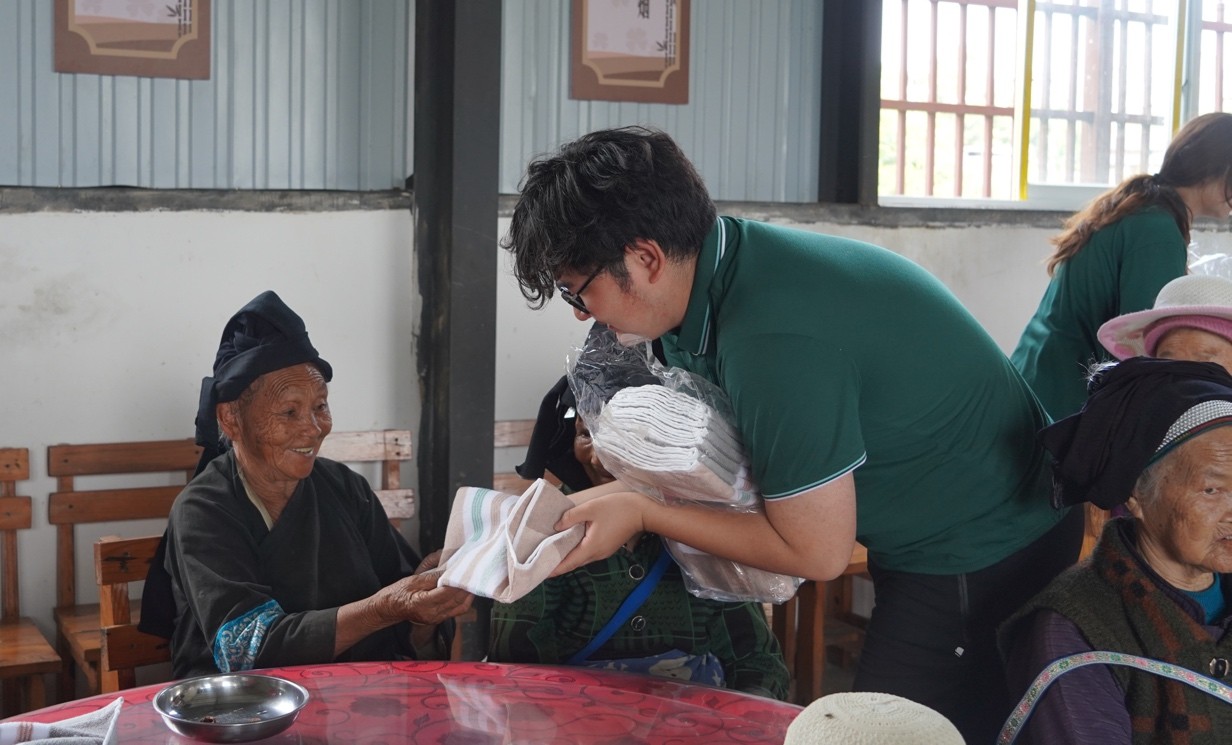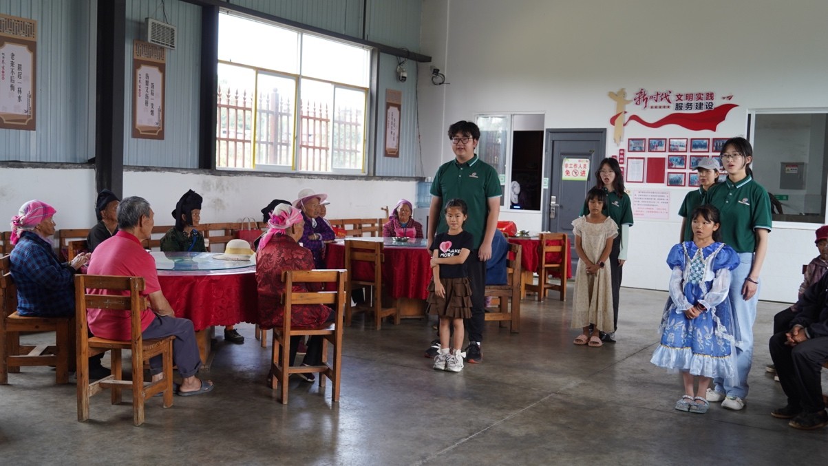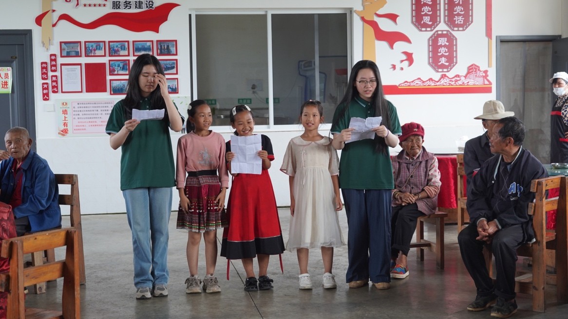 下午,服务团队组织红色经典诗文诵读展演活动,这是本次志愿服务团队深入马关县后开展的第二场展演活动。根据面对群体的不同,重点选取了《七律·长征》《沁园春·雪》等老年群体耳熟能详的经典诗文,以诵读、相声等语言节目为主,穿插歌曲、舞蹈。展演最后,团队还邀请了当地儿童来到活动中心和志愿者们一起朗诵《少年中国说》。现场气氛热烈,不时爆发出热烈的掌声。活动结束后志愿者们还给老人们送上了生活用品。