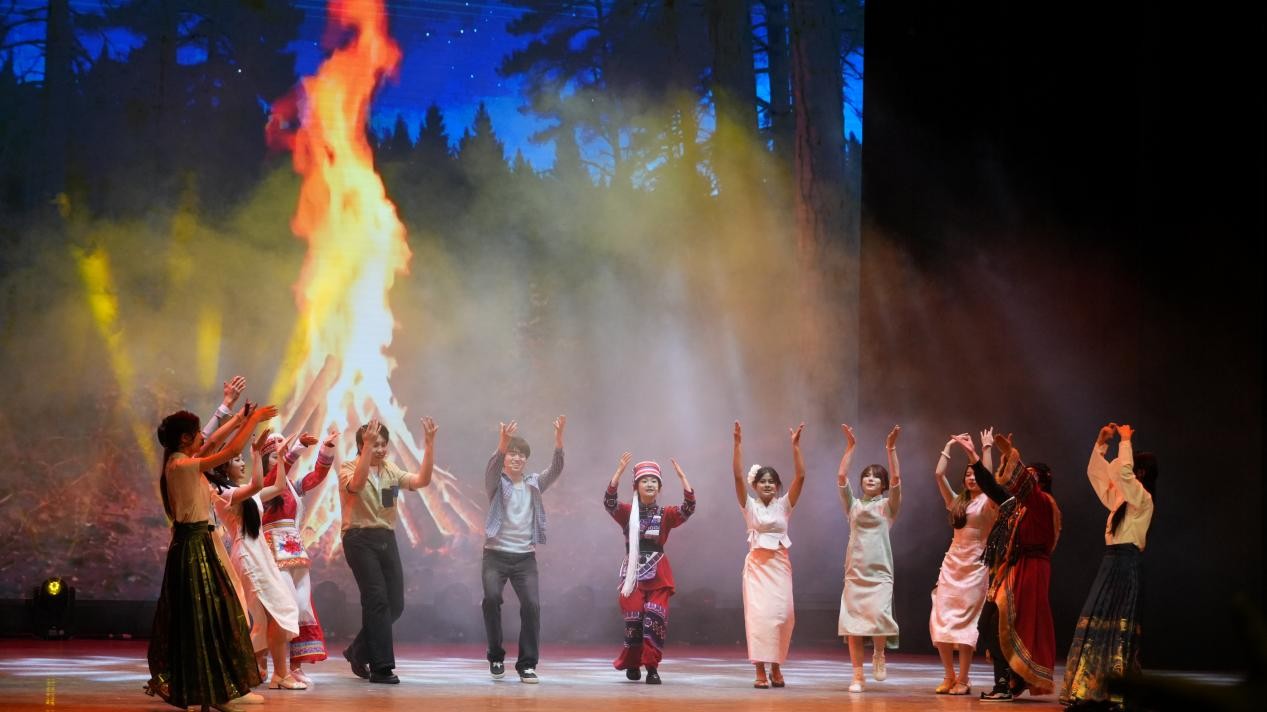 “来客人喽!”一句欢呼迎来演出高潮——火把节狂欢。台下老师们与同学们纷纷起身手牵手,与台上演员一同打跳,现场人浪涌动,跃动的脚步和欢快的鼓点相伴,仿佛穿越至元代诗人文璋甫在《火把节》所描绘的'“灯火烧元夜”现场。